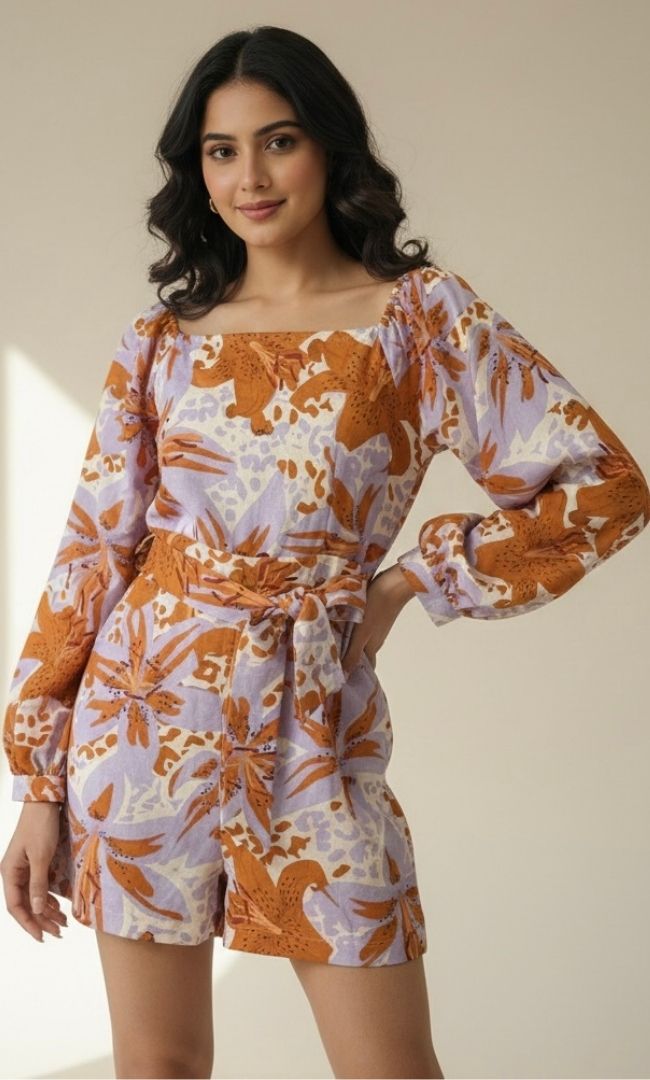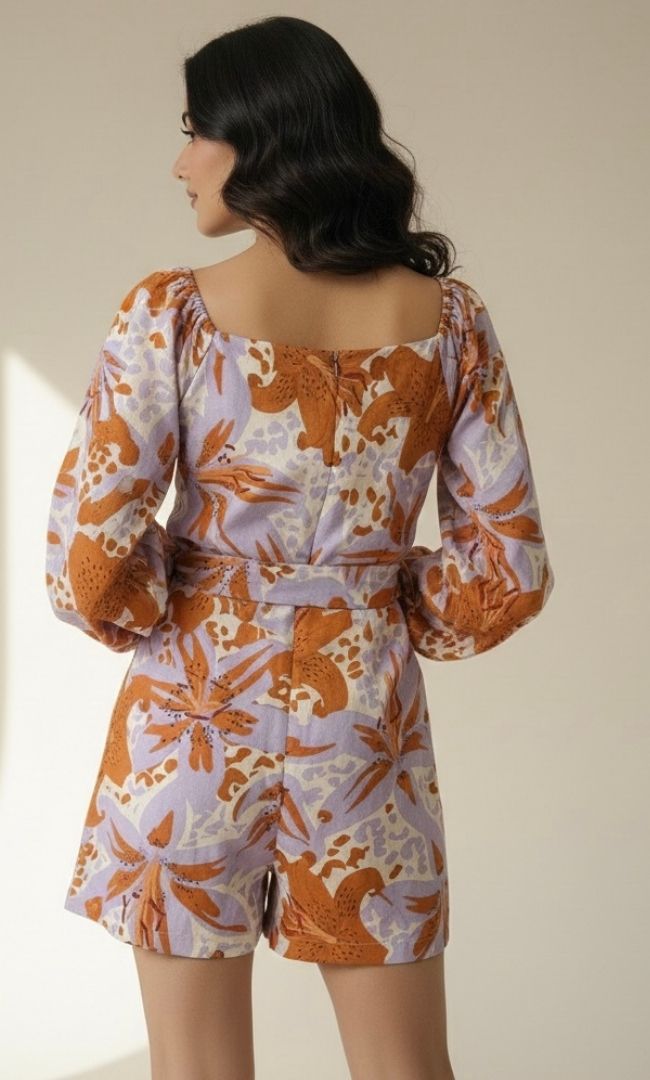 This chic playsuit blends the breezy comfort of premium cotton and linen with a vibrant, earthy floral print. Featuring a sophisticated square neckline, voluminous long sleeves, and a flattering waist tie, it’s the perfect one-piece for effortless daytime elegance.
