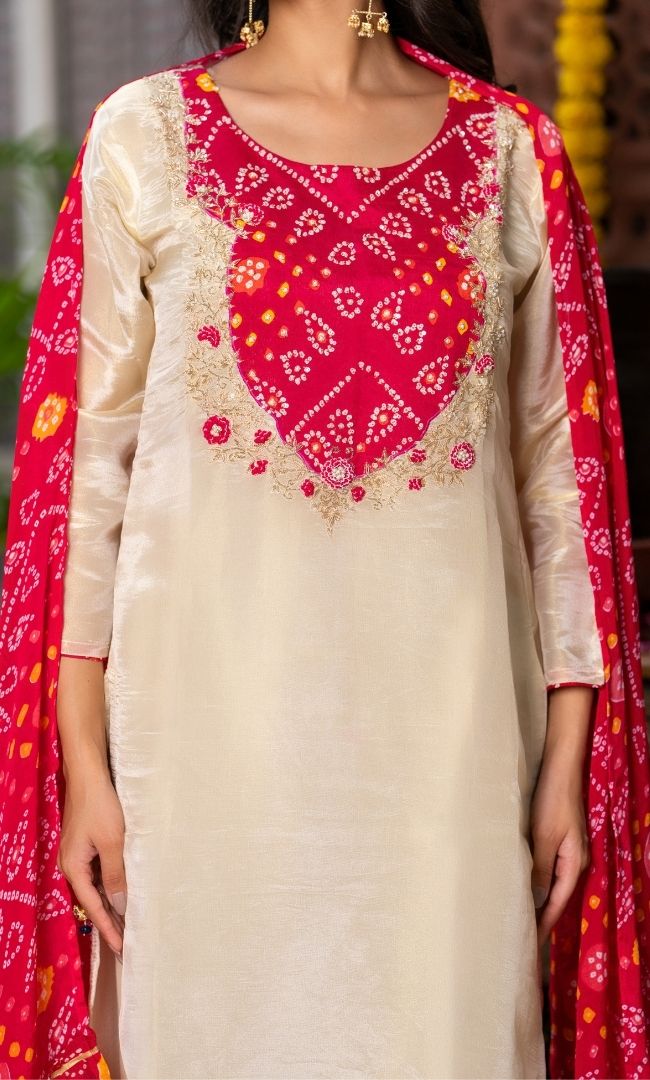 Step into timeless elegance with this Golden Tissue Straight Kurta, beautifully enhanced with a maroon bandhej yoke adorned in intricate handwork embroidery. The combination of rich bandhej patterns and delicate embellishments makes this outfit a statement piece, balancing tradition with sophistication.