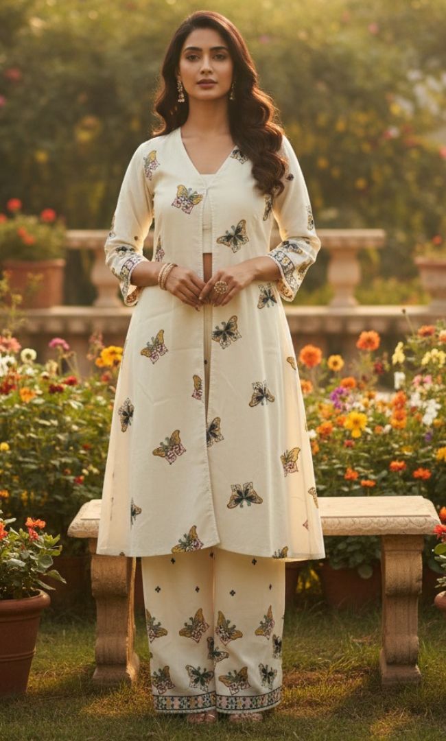 The butterfly kurta co-ord set features a whimsical and playful design, perfect for adding a touch of fun to your wardrobe.
