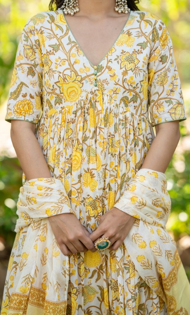This cotton Anarkali set comes with matching pants and a dupatta for a comfortable and elegant look. It features a V-neckline in the front and a deep V-neck at the back, adding a stylish touch. Designed with half sleeves and a convenient pull-on closure, this outfit is perfect for effortless everyday wear.