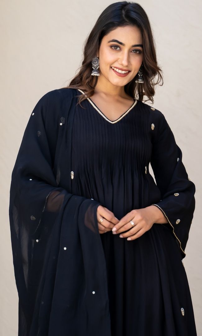 Consisting of golden beaded and white pearl handwork, this panel-cut kurta makes a beautiful fit for any event. Its yoke has knife pleats that lay beautifully and v-neck shimmering with the same hand work as well. The dupatta, as well, has a pearl work that resembles flowers in the midnight.