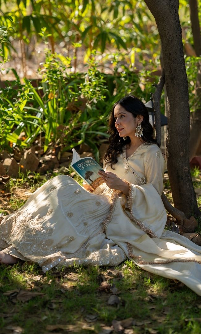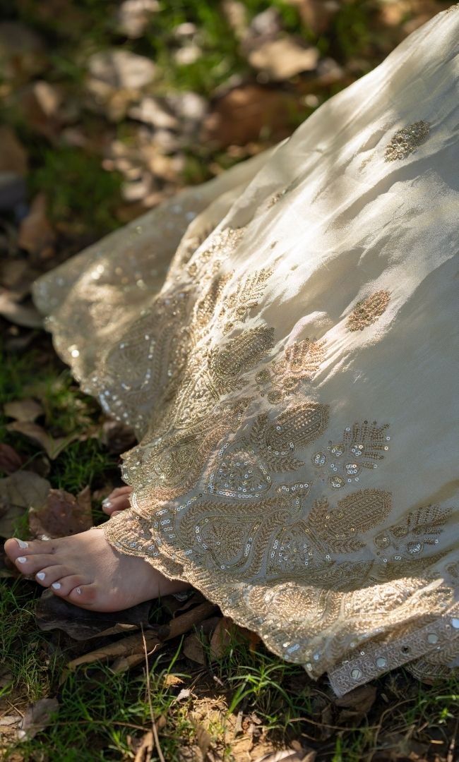 Ivory Embroidered Tissue Angrakha Set featuring a V-neck angrakha kurta with full sleeves and traditional tie-up closure. Adorned with intricate mirror-work lace on the kurta and flared palazzo, it comes with a matching dupatta for a graceful, festive look.