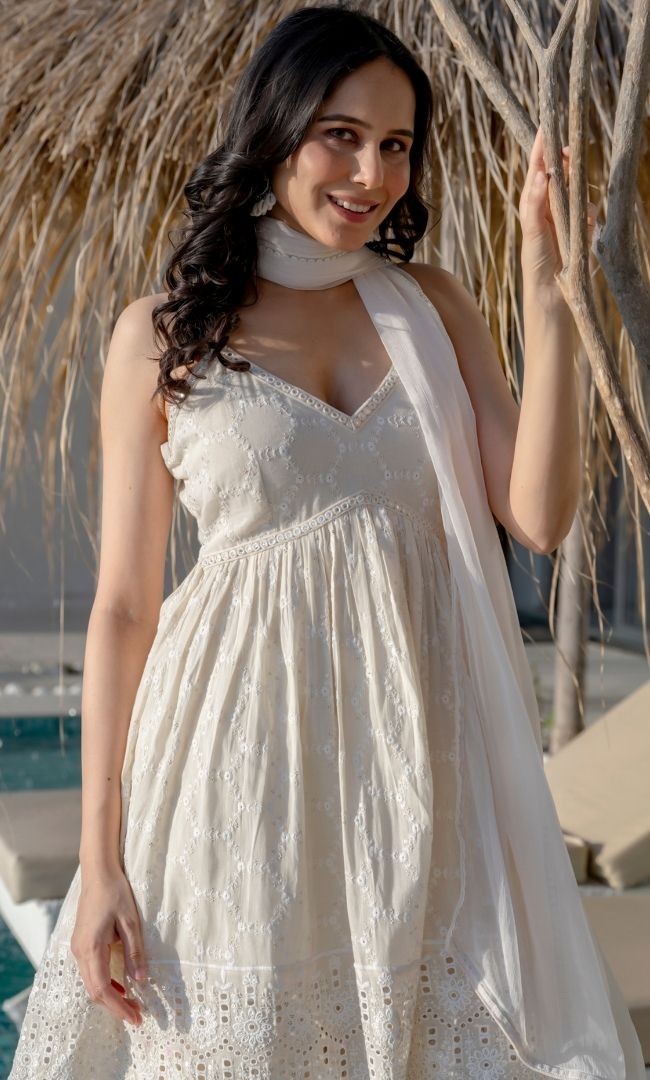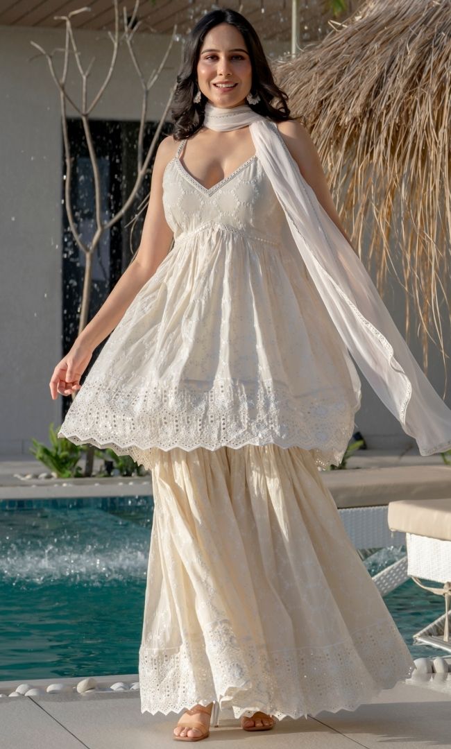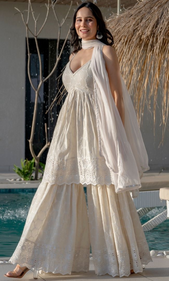 Like a moonlight bloom, this sharara set enchants with this delicate chikankari work, a vision of grace & femininity