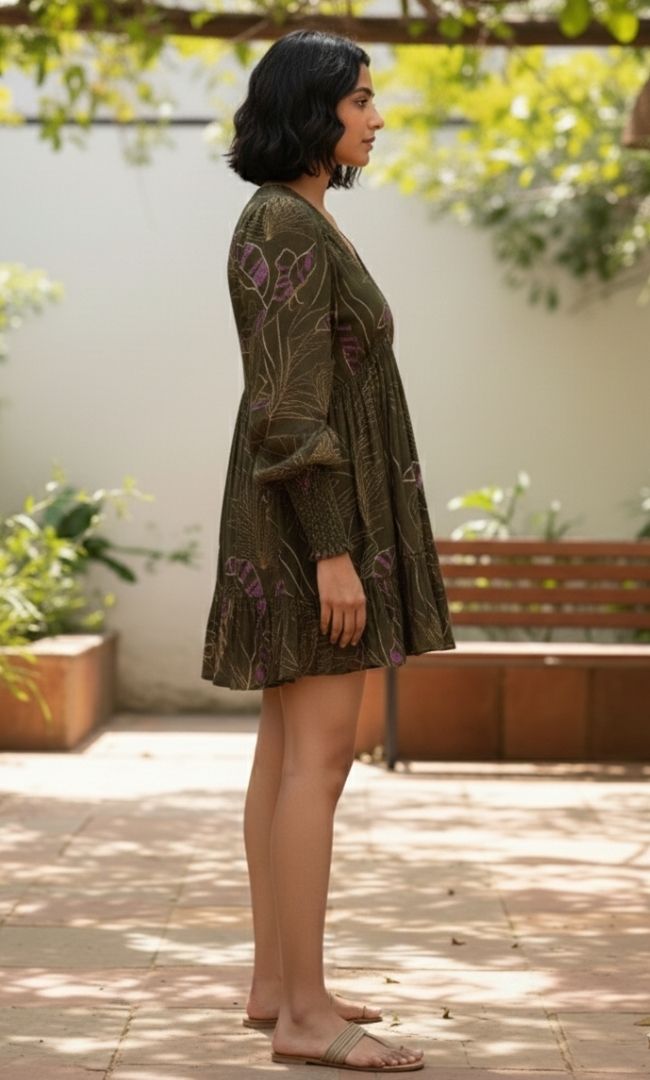 Step into effortless elegance with our Olive Green Viscose Muslin Dress. Crafted from premium, breathable viscose muslin, this dress features a deep V-neckline and intricate botanical prints highlighted by pops of regal purple. The smocked cuff detailing on the voluminous sleeves adds a touch of vintage charm, while the tiered ruffle hem creates a playful, feminine silhouette.
