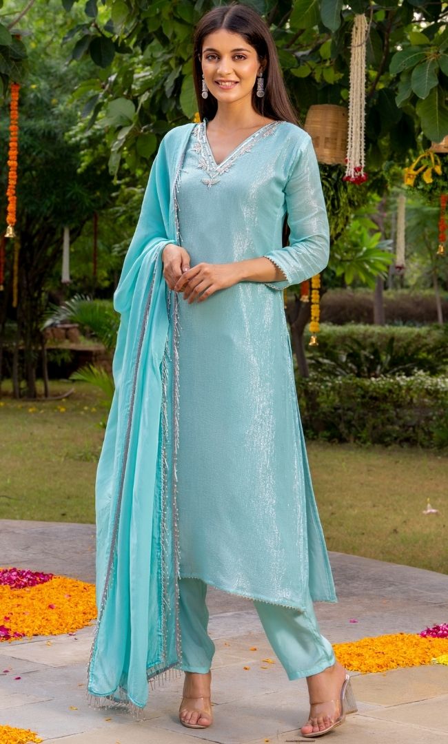 Are you ready for a sweet escape into the world of comfortable and stunning fashion? The  Lemon Cyan Blue Kurta Set is the perfect ensemble for this getaway! The set showcases a lurex Kurti featuring handwork detailing paired with a pair of pants and organza dupatta.
