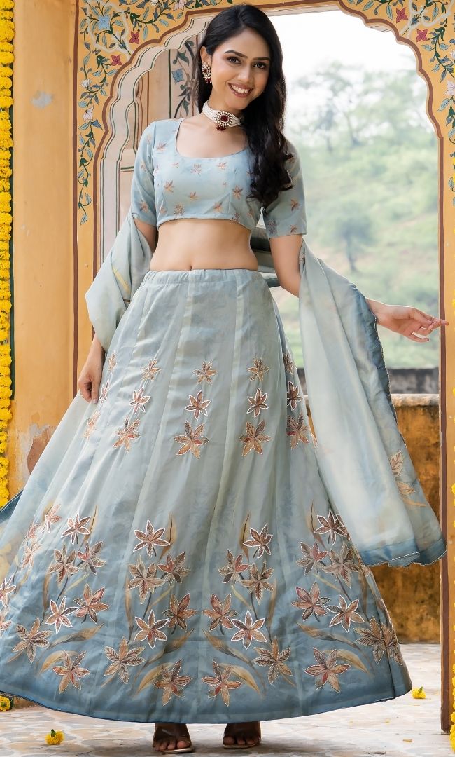 Crafted in delicate tissue fabric, this lehenga set is adorned with intricate handwork highlights. The floral motifs across the lehenga add a graceful charm, paired with a matching blouse and dupatta for a refined festive look.