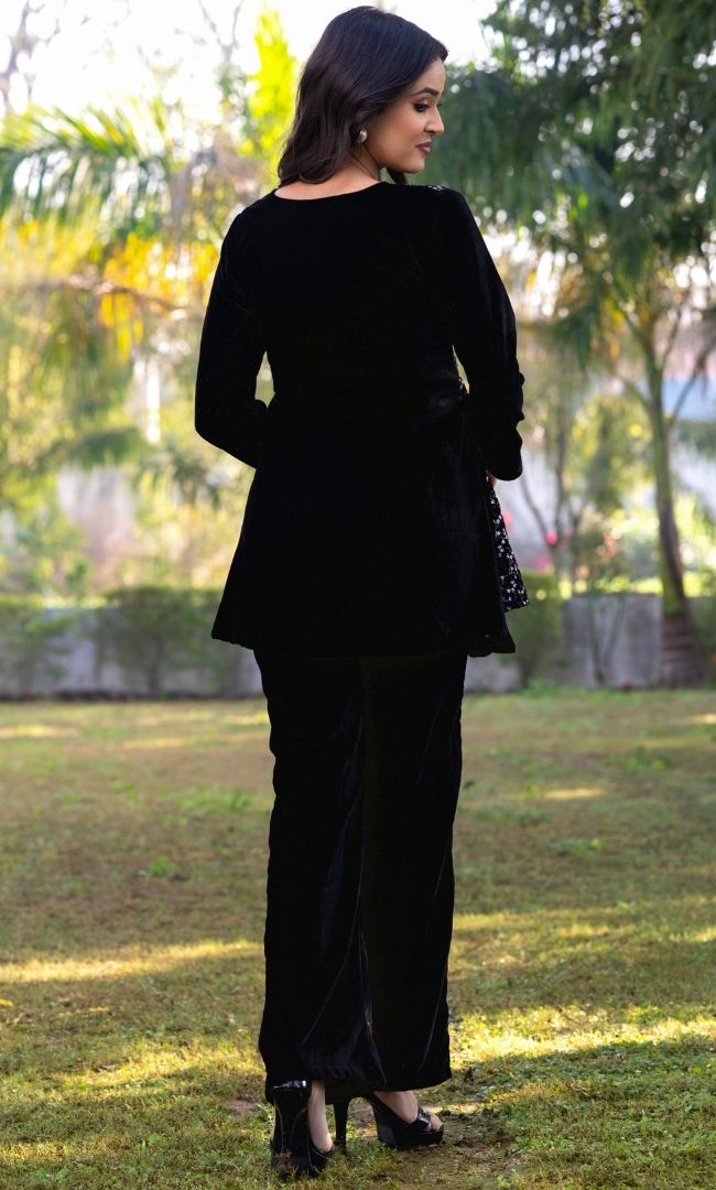 Introducing our Black Embroidered Velvet Co-Ord Set — a chic pairing of comfort and style. The set includes solid black pants paired with a top featuring a dynamic combination of solid black velvet and embroidered velvet. This ensemble effortlessly blends sophistication with a touch of texture, making it a versatile and fashionable choice for various occasions.