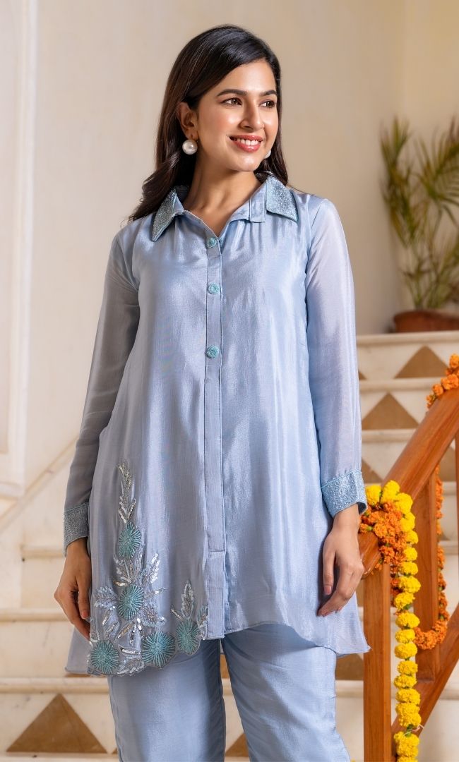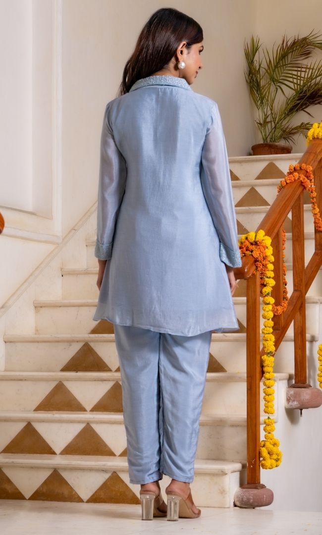 Step into the realm of Blizzard Blue Co-Ord set, where simplicity meets sophistication. This enchanting Co-ord Set features a blue top with asymmetrical detailing on hem, adorned with a broad collar that adds a touch of drama. The handwork embellishments on top infuse a hint of glamour into the ensemble, front buttons and classic long sleeves add an extra element of beauty. With understated elegance and timeless style, this set is a dream come true.