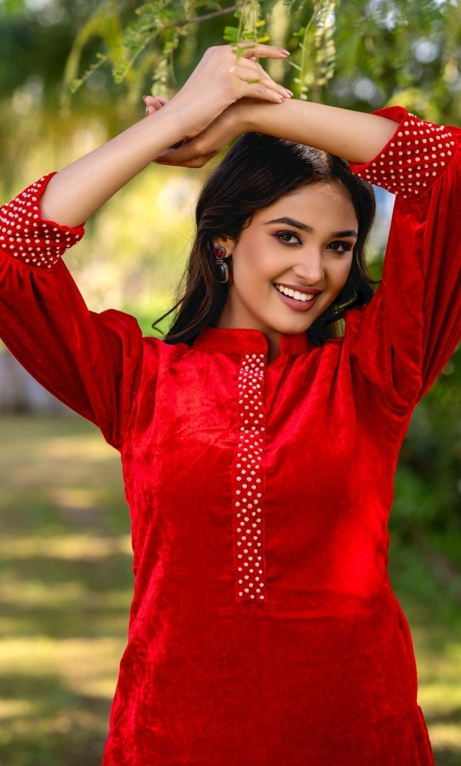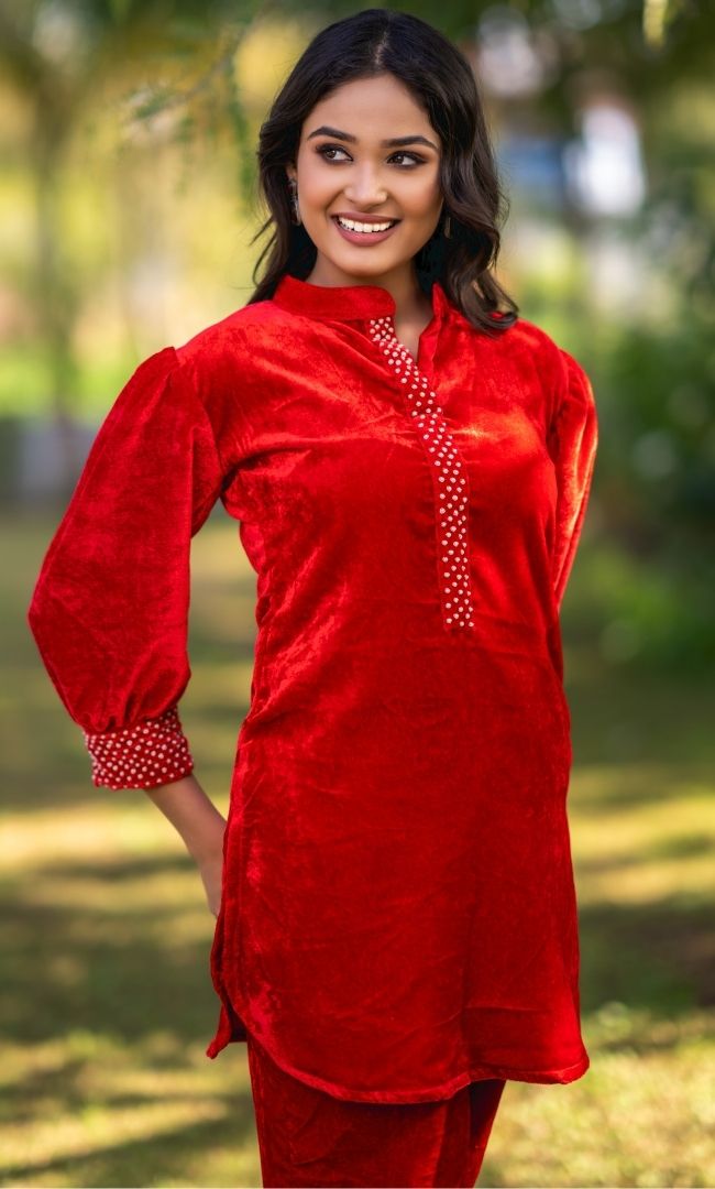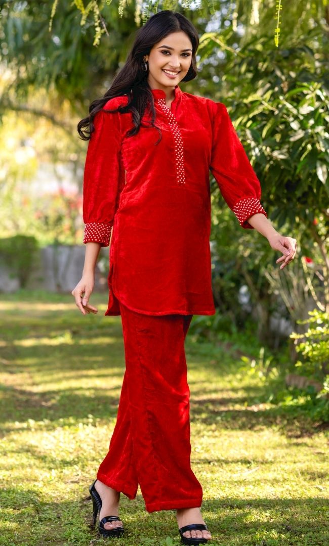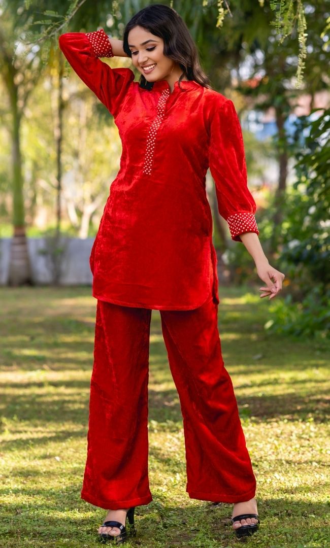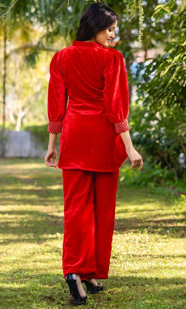 Introducing our Candy Bomb Velvet Twinset — a striking ensemble that blends vibrant style with meticulous details. This red set features handwork embellishments on the front placket and trendy puff sleeves, adding an artistic touch to the modern silhouette. Paired with chic palazzo pants, this co-Ord set is designed for those who appreciate bold fashion with a hint of sophistication. Perfect for festive occasions, the "Candy Bomb Velvet Twinset" invites you to make a bold and stylish statement effortlessly. Carefully crafted and available in various sizes for the perfect fit.