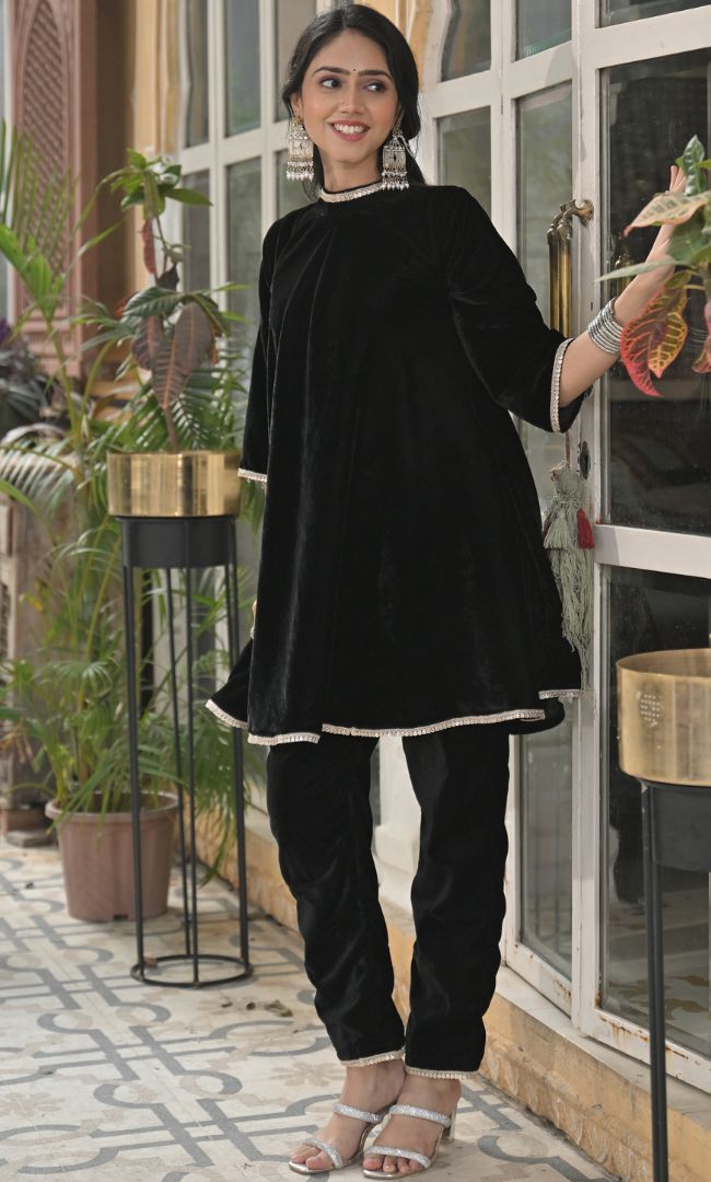 Introducing our Carbon Black Velvet Co-Ord Set — a chic pairing of comfort and style. The set includes solid black pants paired with a top featuring a dynamic combination of solid black velvet and embroidered velvet. This ensemble effortlessly blends sophistication with a touch of texture, making it a versatile and fashionable choice for various occasions.