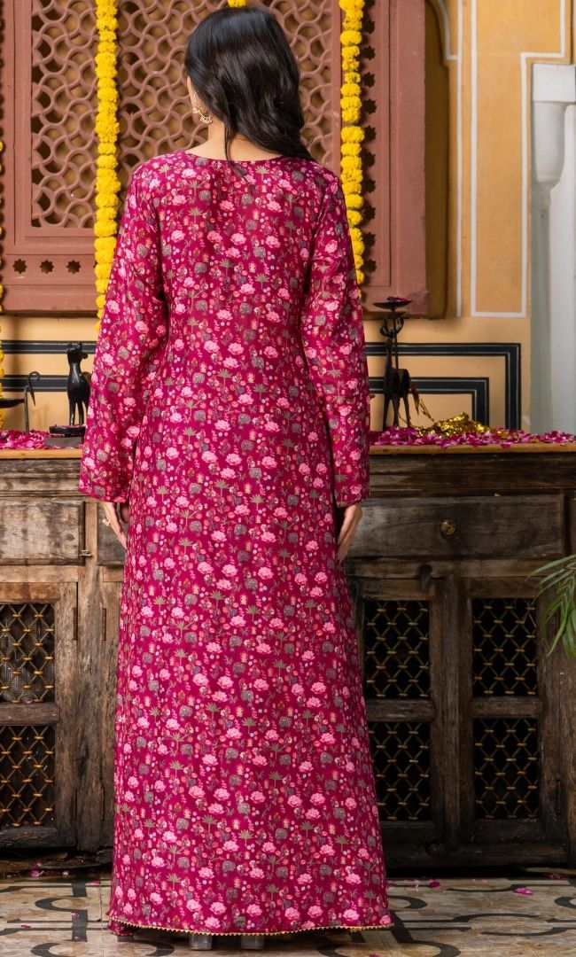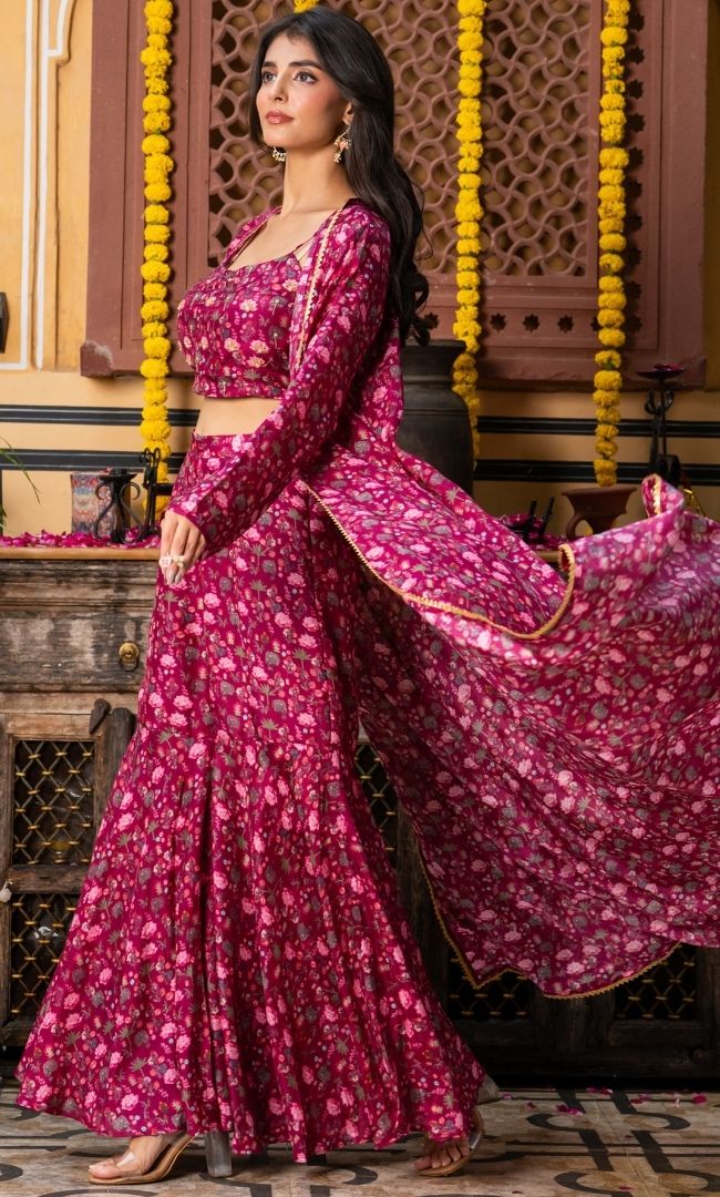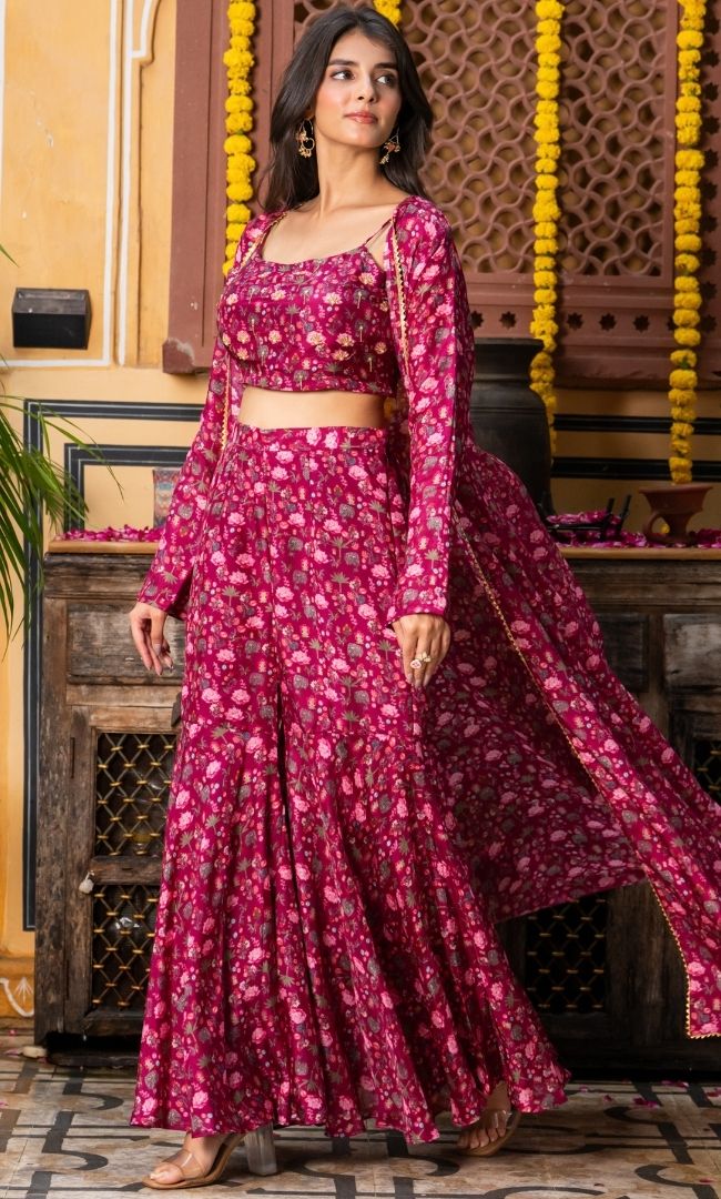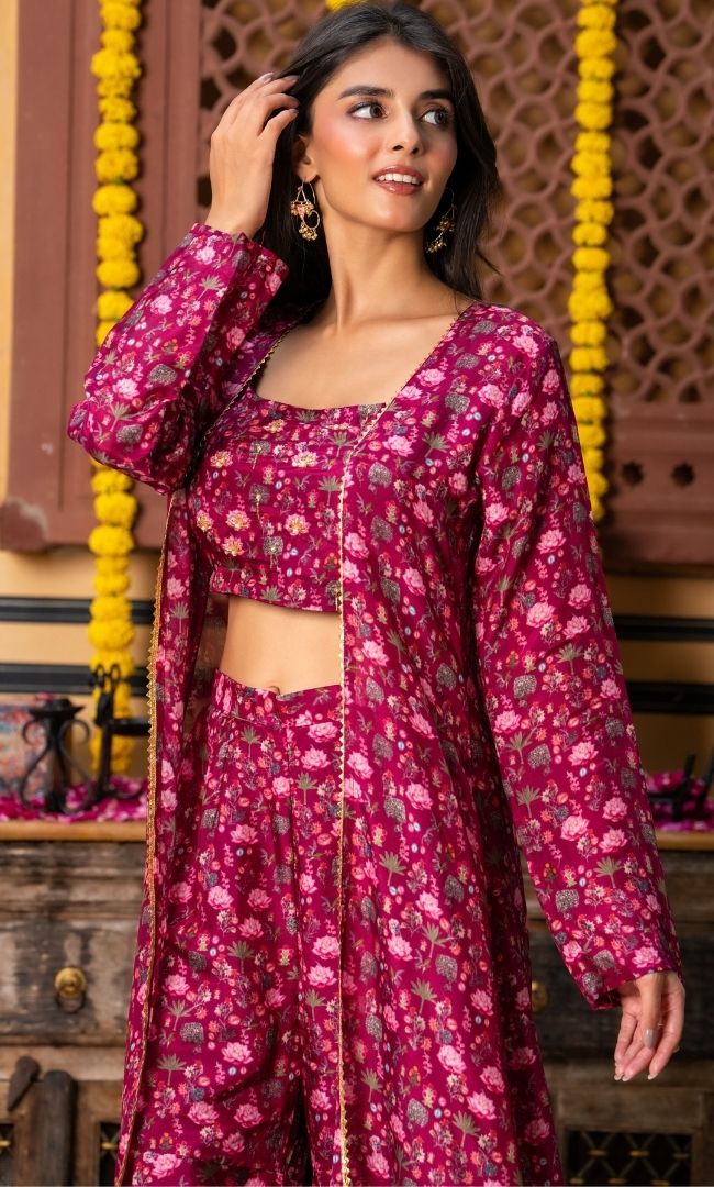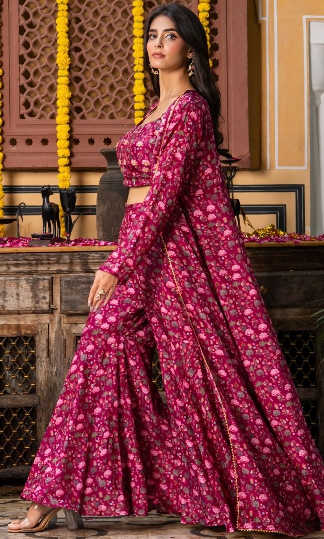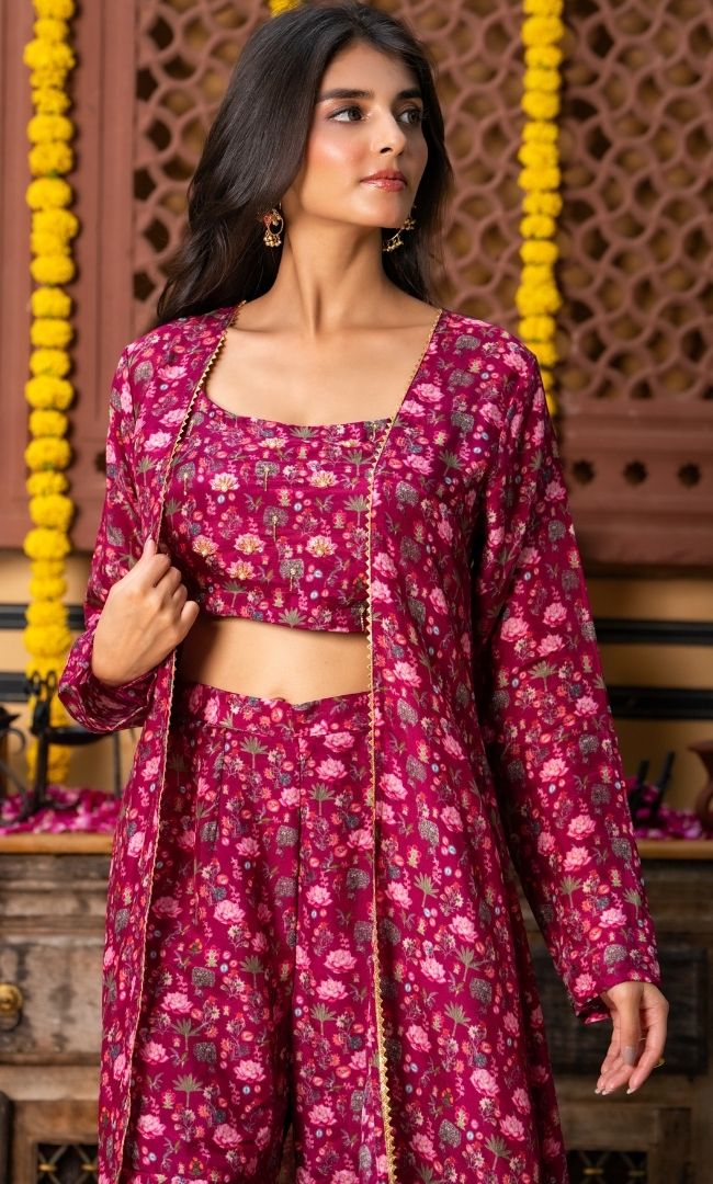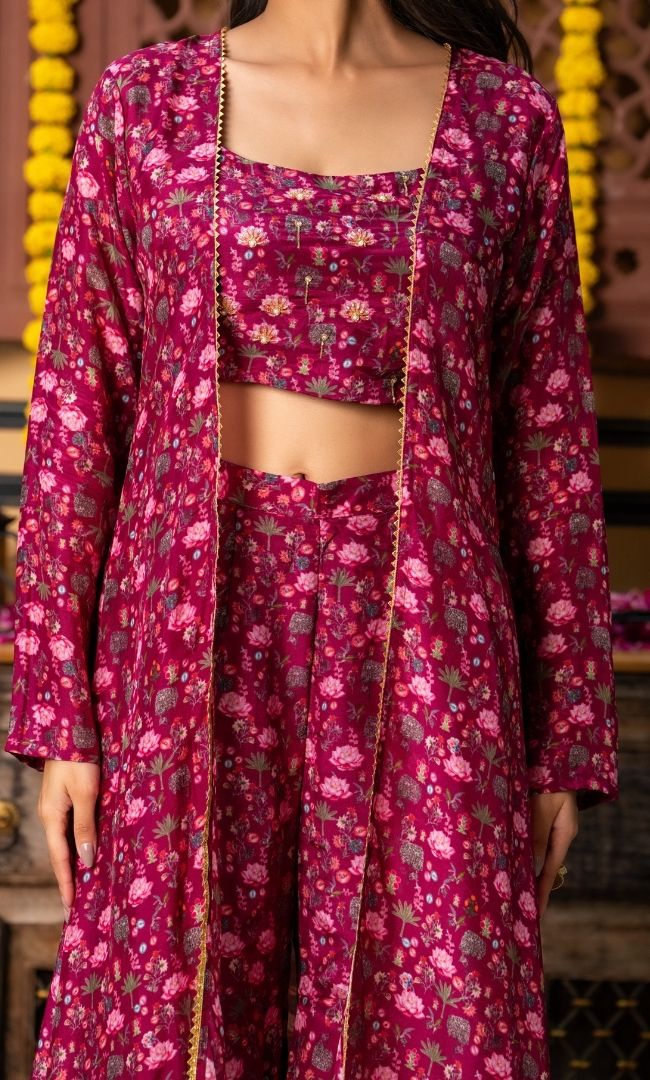 Crafted in rich upada silk, this elegant three-piece set features a stylish blouse adorned with intricate aari handwork that adds subtle sparkle and sophistication. The matching sharara bottoms flow gracefully, while the coordinating shrug adds a contemporary twist to the look. The deep wine hue, paired with delicate craftsmanship, makes this ensemble perfect for festive evenings, weddings, and special occasions.