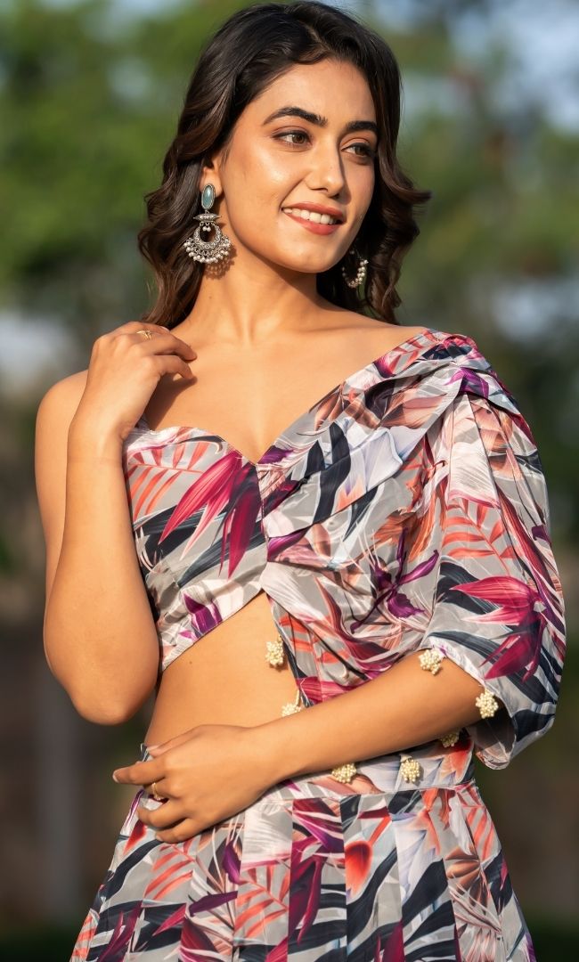 We bring to you this lehenga, consisting of a spaghetti blouse with a drapey twist. The drape lands on the left shoulder with a few pearl bursts dangling delicately. The lehenga itself is fully flared and ready to serve.