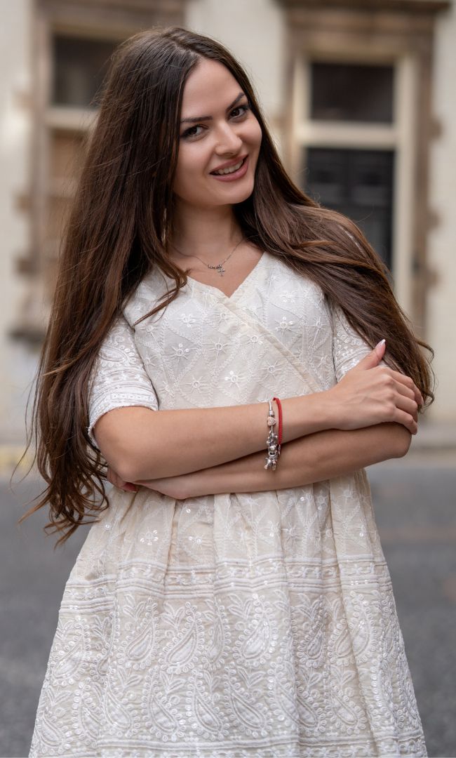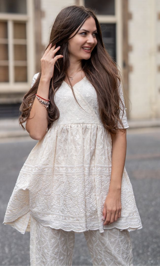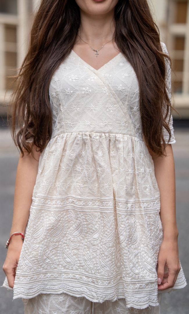 Glam up your style quotient by opting for the ''Pearl Chikankari Top With Pant Set'' has a heavily embroidered chikankari top and b, and the outfit has v- a neckline, and half sleeves. The bottom has flared pants of the same fabric.