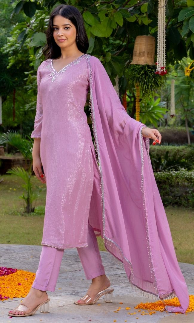 Are you ready for a sweet escape into the world of comfortable and stunning fashion? The  Dusty Pink  Kurta Set is the perfect ensemble for this getaway! The set showcases a lurex Kurti featuring handwork detailing paired with a pair of pants and organza dupatta.