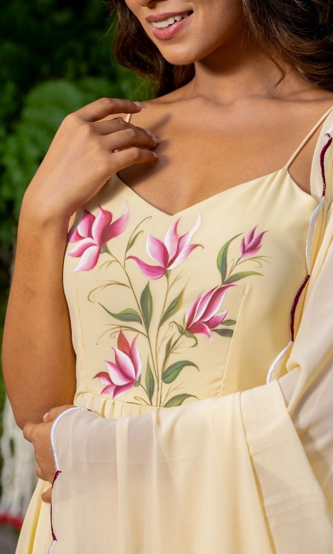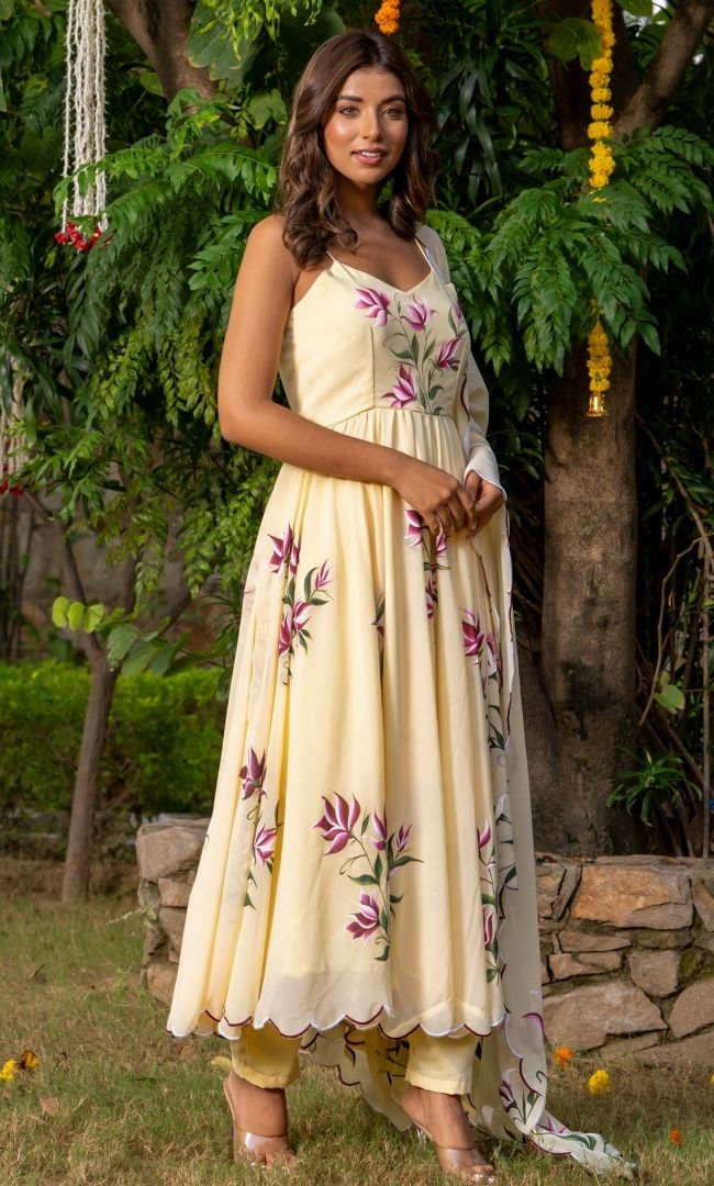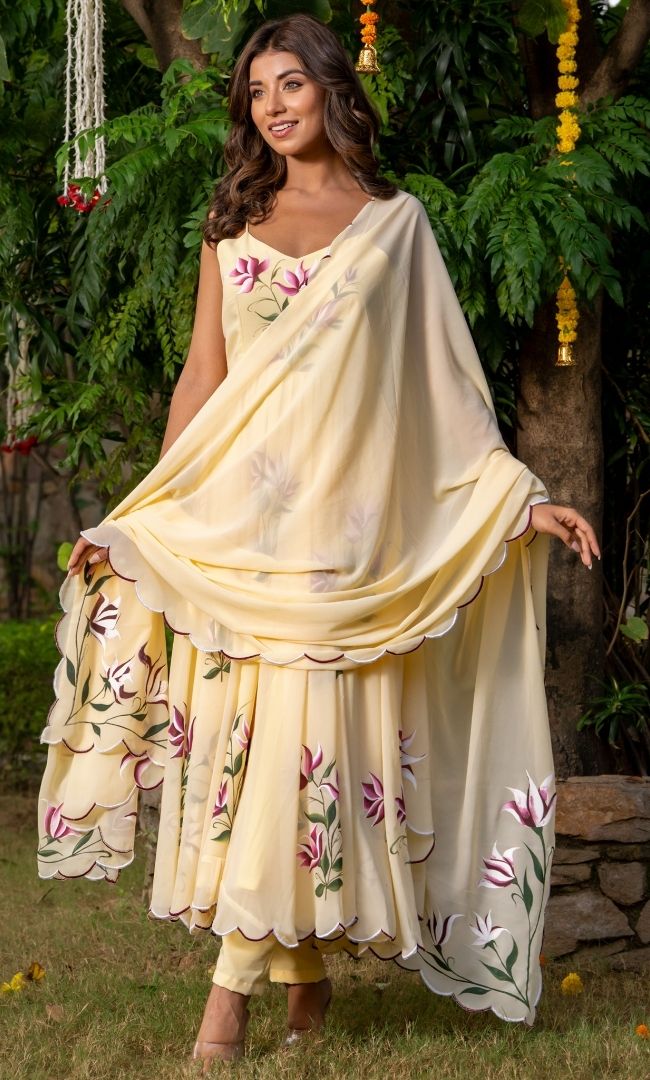 Prepare to dazzle like the life of the garden party in our Crayola Handpainted Suit Set. Crafted from the prettiest Pastel color Georgette, it's like wearing a piece of a summer sunset. Hand-painted flowers waltz gracefully across the fabric, adding an artistic touch that's as playful as a gentle breeze.