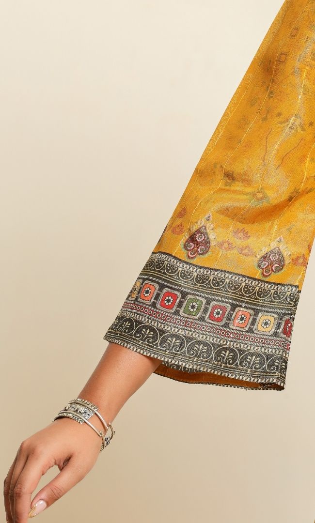 This is a traditional long kurta likely made of lightweight flow fabric with floral print and ornament-like patterns suitable for a special occasion outing or semi-formal wear.