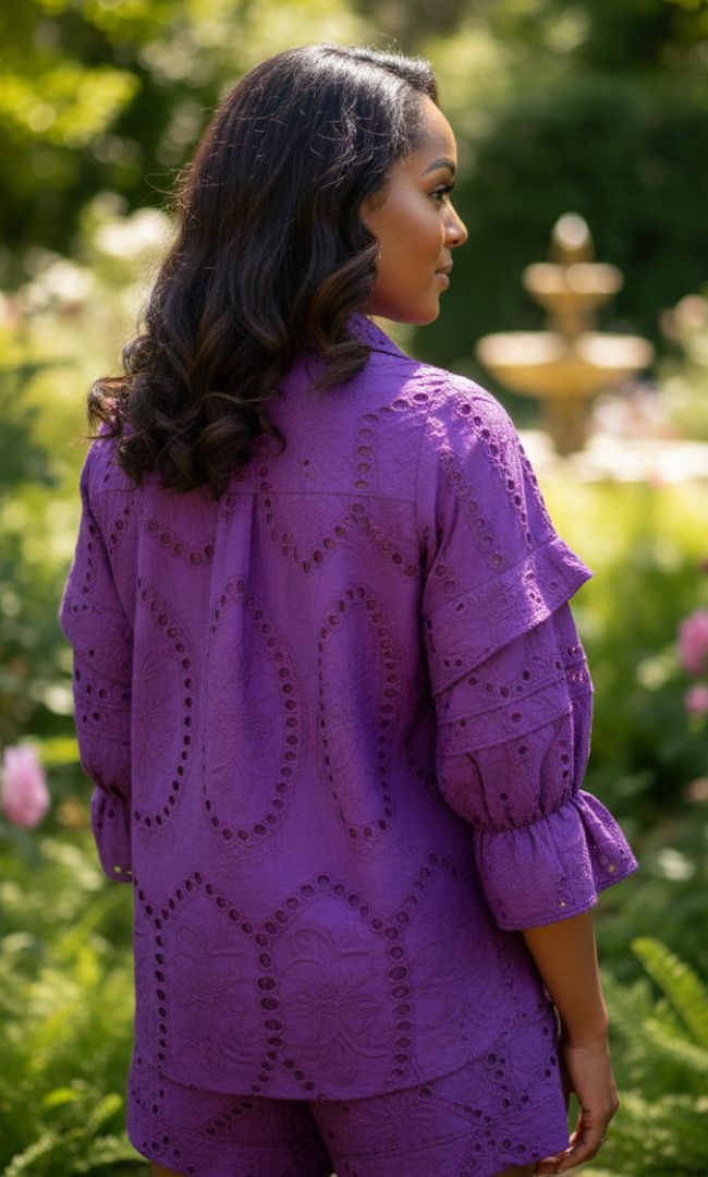 This sophisticated cotton Schiffli co-ord set is a highlight for the House of Jamoti summer collection. It features an intricate eyelet embroidery throughout, a classic collar neckline, and a clean front button closure for a polished yet breezy look. The 3/4th sleeves with subtle ruffle detailing add a feminine touch, making it a perfect ensemble for an effortless transition from day to evening.