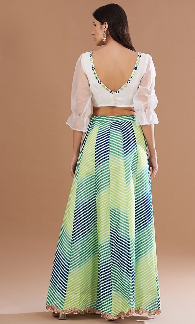Green-Leheriya Kalidar Lehenga & Mirror Work Blouse With Dupatta Set