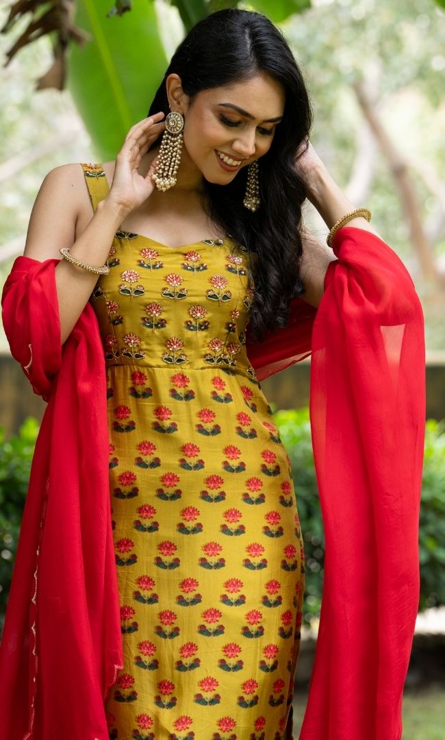This vibrant green printed kurta paired with straight pants exudes effortless charm. The playful motifs add a touch of tradition, while the contrasting pink dupatta enhances the festive appeal. A perfect pick for casual celebrations, day gatherings, or a cheerful ethnic look.