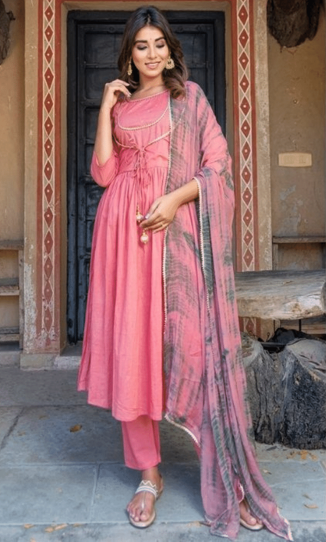 PEACH CREAM CHANDERI STRAIGTH KURTA PANT WITH DUPATTA SET
