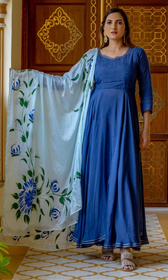 YALE BLUE SOLID ANARKALI KURTA WITH HAND PAINTED DUPATTA