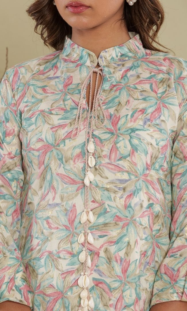 Introducing our Bloom Floral Printed Co-Ord Set, a harmonious blend of floral finesse and intricate detailing. The top of this enchanting ensemble features a pastel floral print, evoking the beauty of a blooming garden in full splendor. Adding an extra layer of elegance, delicate kori lace detailing graces the neckline, creating a perfect balance of charm and sophistication paired with straight pants.