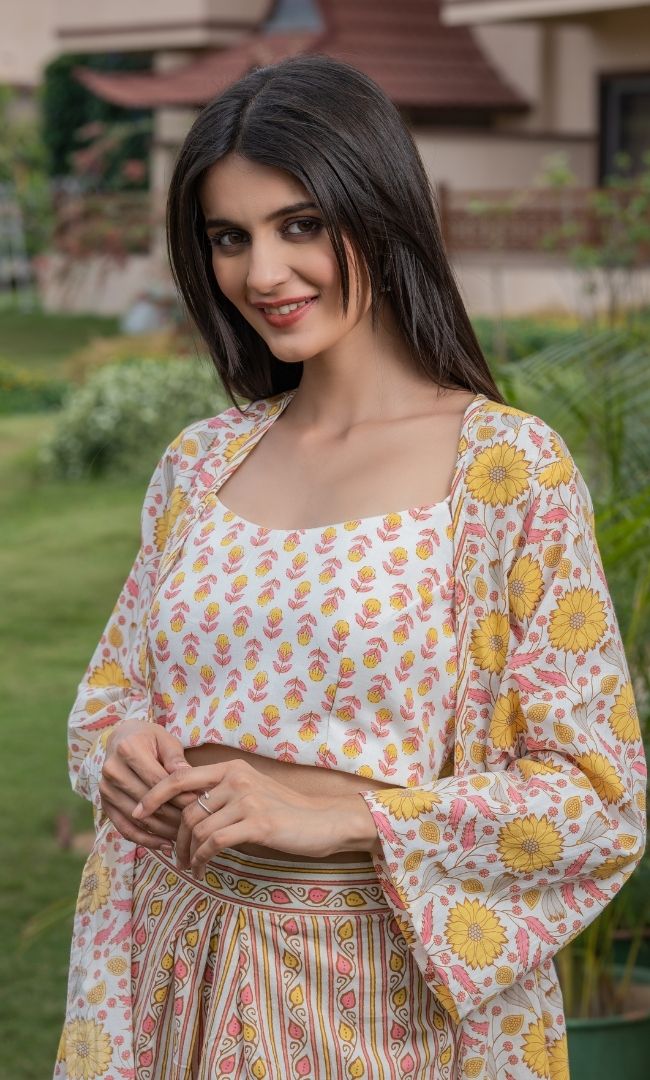 In a world full of trends create your trend with this comfortable cotton off-white floral printed co-ord set to kick off this hot summer. Made with the combination of a sweetheart neckline bustier, a palazzo and a floral printed shrug which enhances the garment.