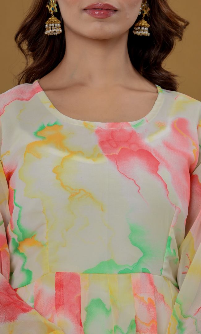 Turn heads this festive season with this gorgeous Pink Marble  Anarkali Set from HOUSE OF JAMOTI featuring a beautiful marble print and a round neck. Made with premium quality fabric, this set contains an Anarkali kurta, a pair of pants, and a dupatta. Style it up with your favourite pair of stilettos and a fancy clutch to complete your outfit.