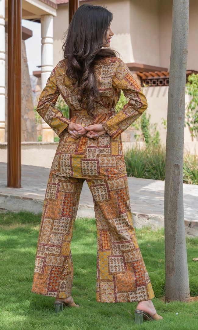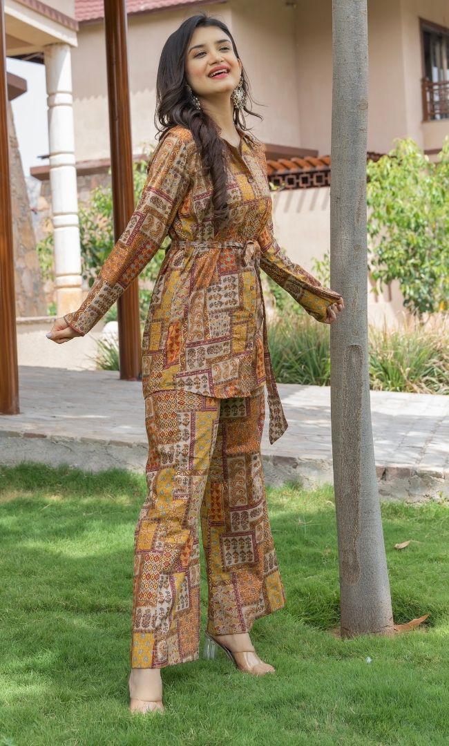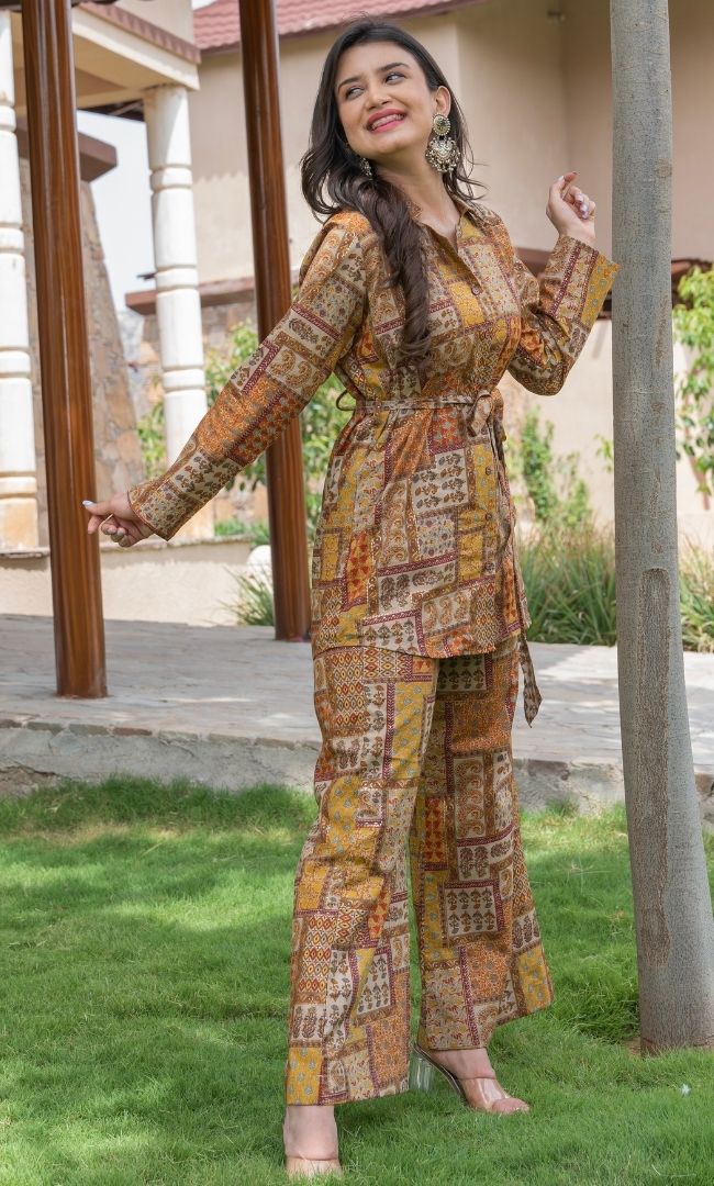 Eude the effortlessness that comes along with layering the shirt collar top & pants. The statement co-ord is created in the cotton fabric with the elegant palette of the Lilly flower. the straight pants come along with full elastic while the top has tie-ups on the waist for comfort & styling.