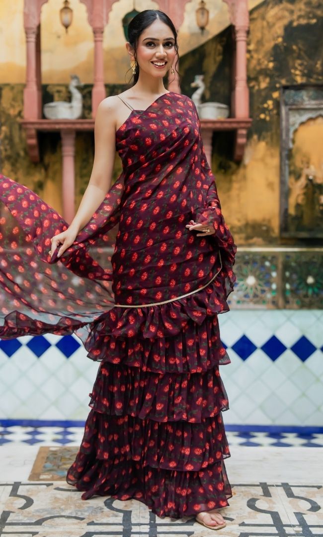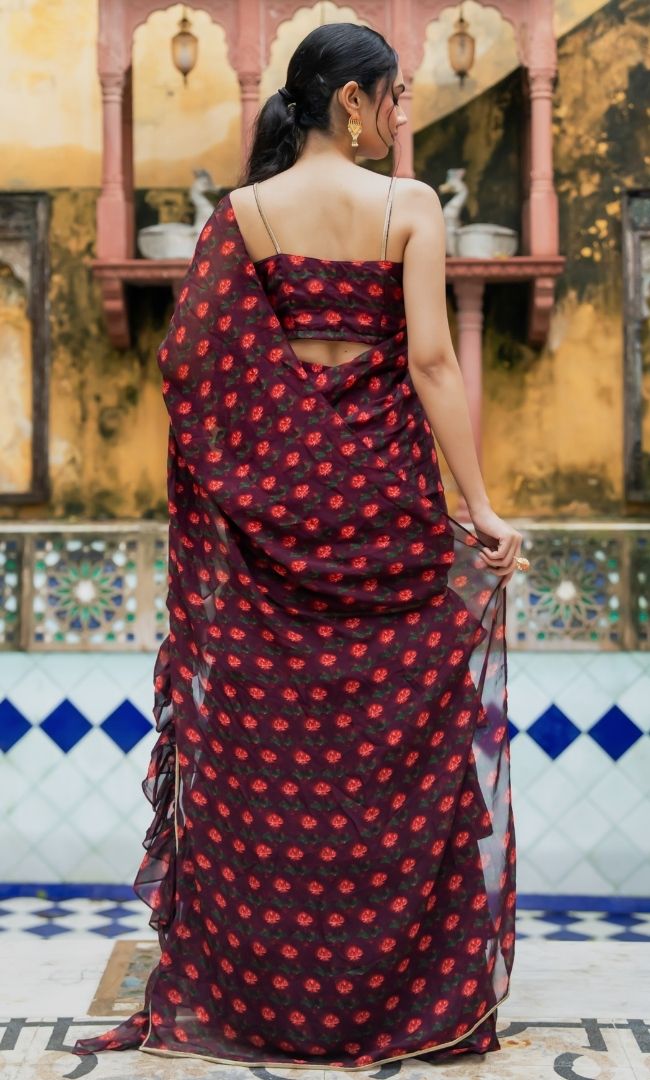 The saree is crafted in lightweight organza with elegant ruffles, paired with a sleeveless upada silk blouse featuring a sweetheart neckline and side-zip closure for a perfect fit.