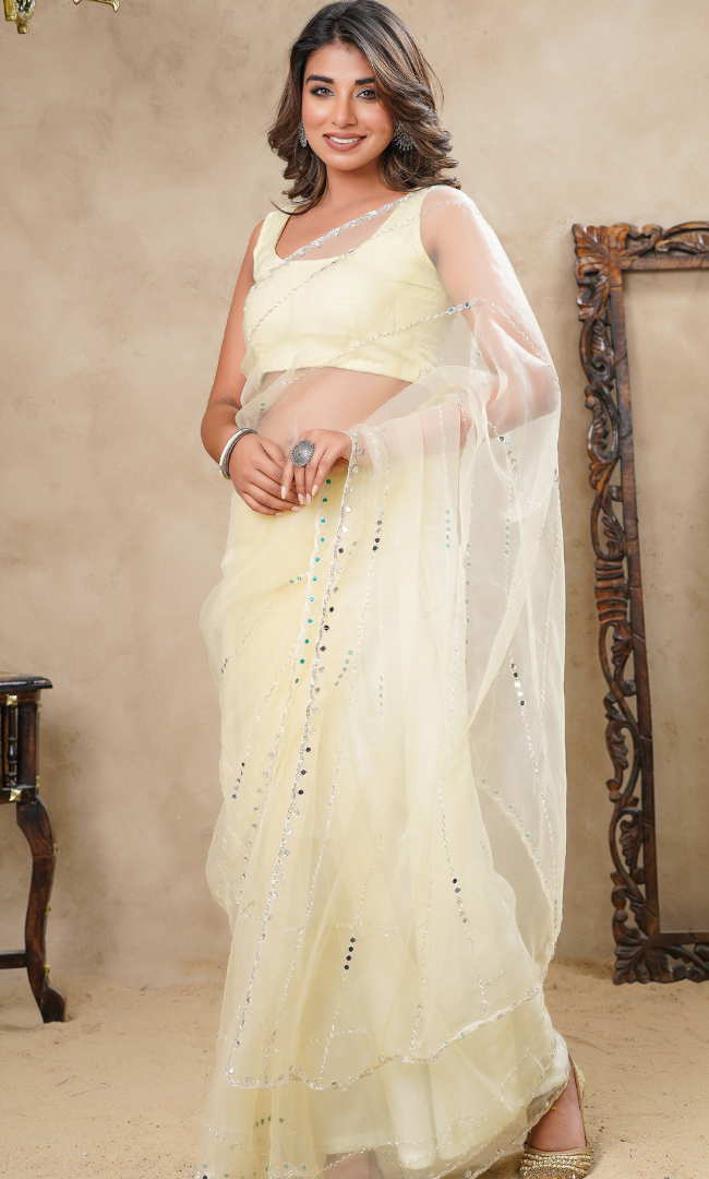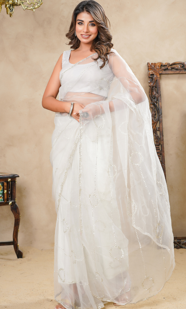 Beige Cutdana Circles With Sequence Bead Hightlight Saree
