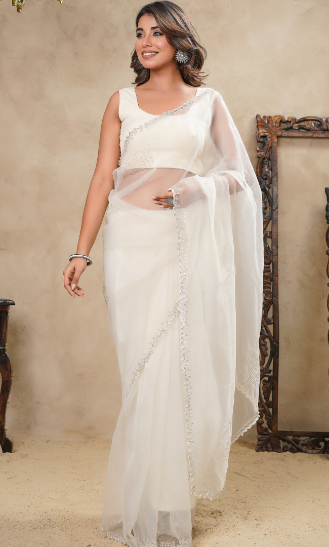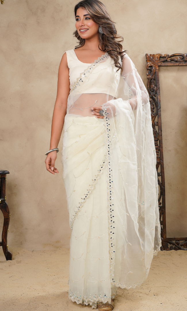 Beige Zigzag Border Cutdana Work With Leafy Mirror And Scalup Saree