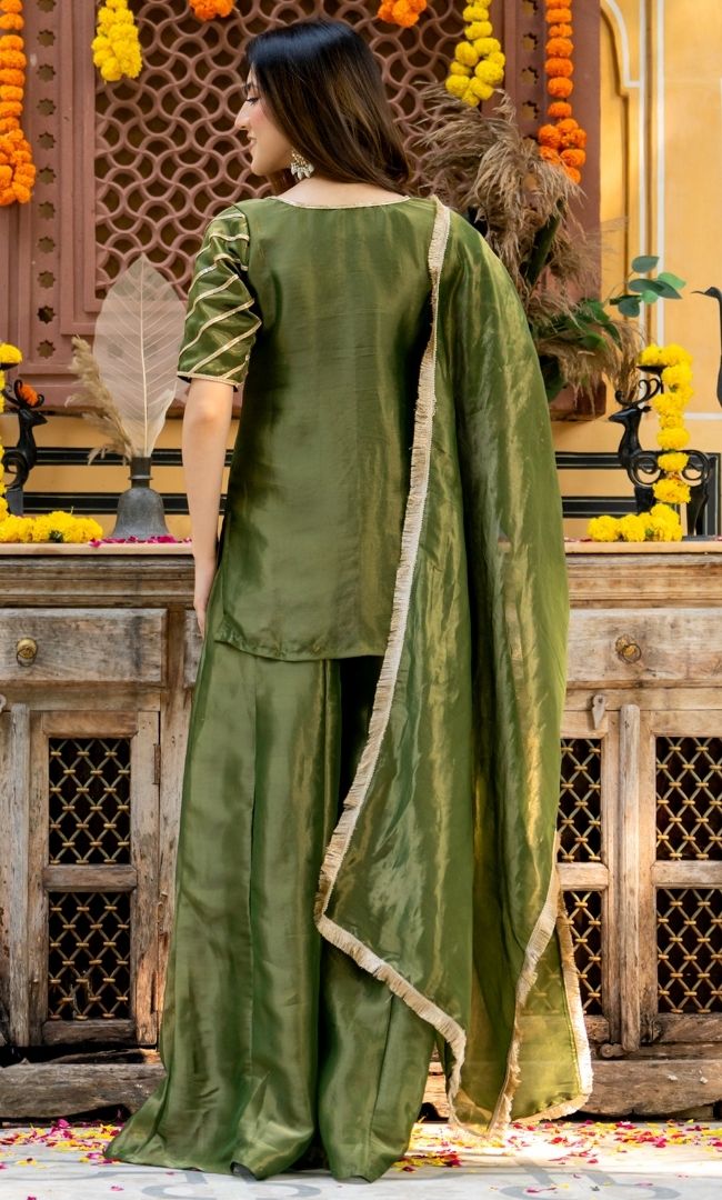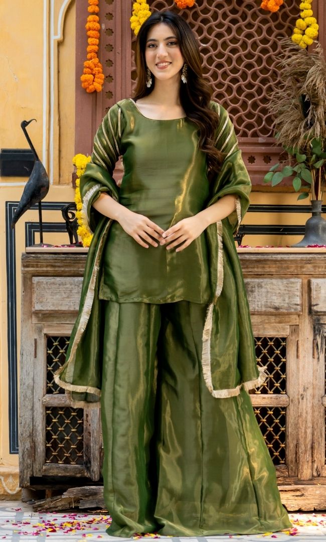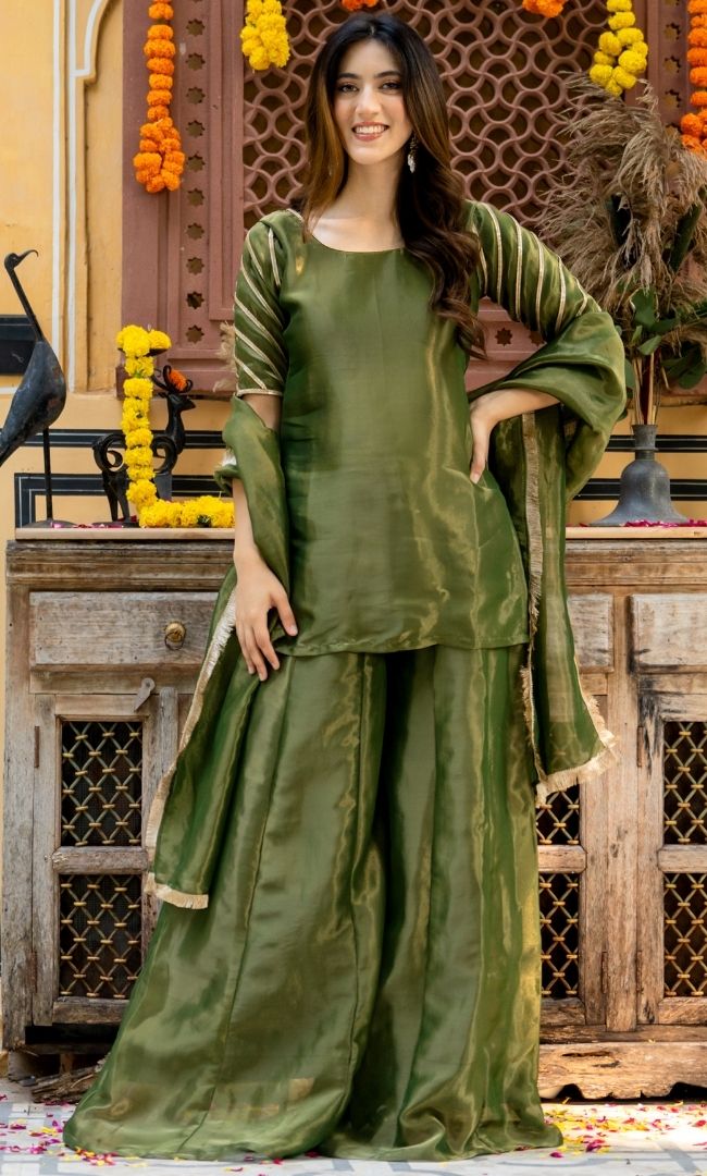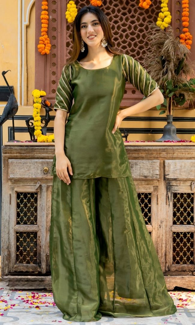 The Kurta Palazzo set is an elegant ensemble that perfectly combines comfort and style. Paired with wide-legged palazzo pants, this set offers a relaxed look. The plazas are designed for ease of movement, making them ideal for various occasions.