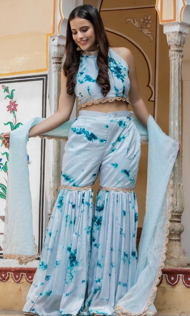 BLUE SHIBORI HALTER TOP & SHARARA WITH DUPATTA SET