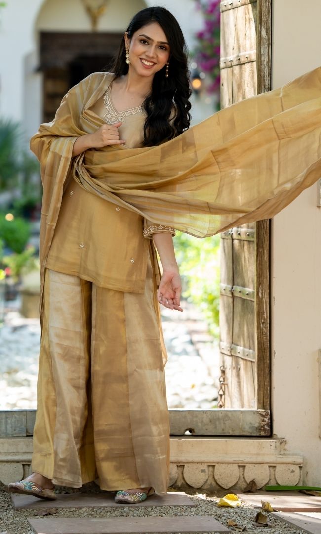 Elara Golden Tissue Sharara Set
