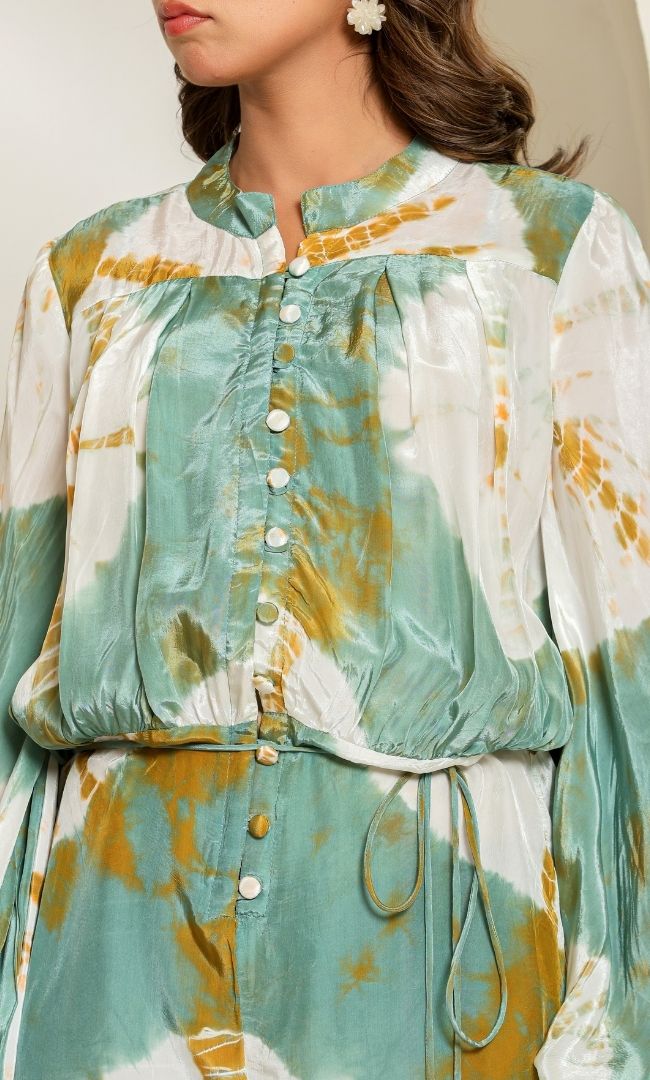 This is a beautiful jumpsuit with tie-dye on the upper side, boasting a relaxed fit with front button detailing, Soft pleating around the neckline, and voluminous balloon sleeves and waist belt perfect for brunches, vacations or a casual day out.