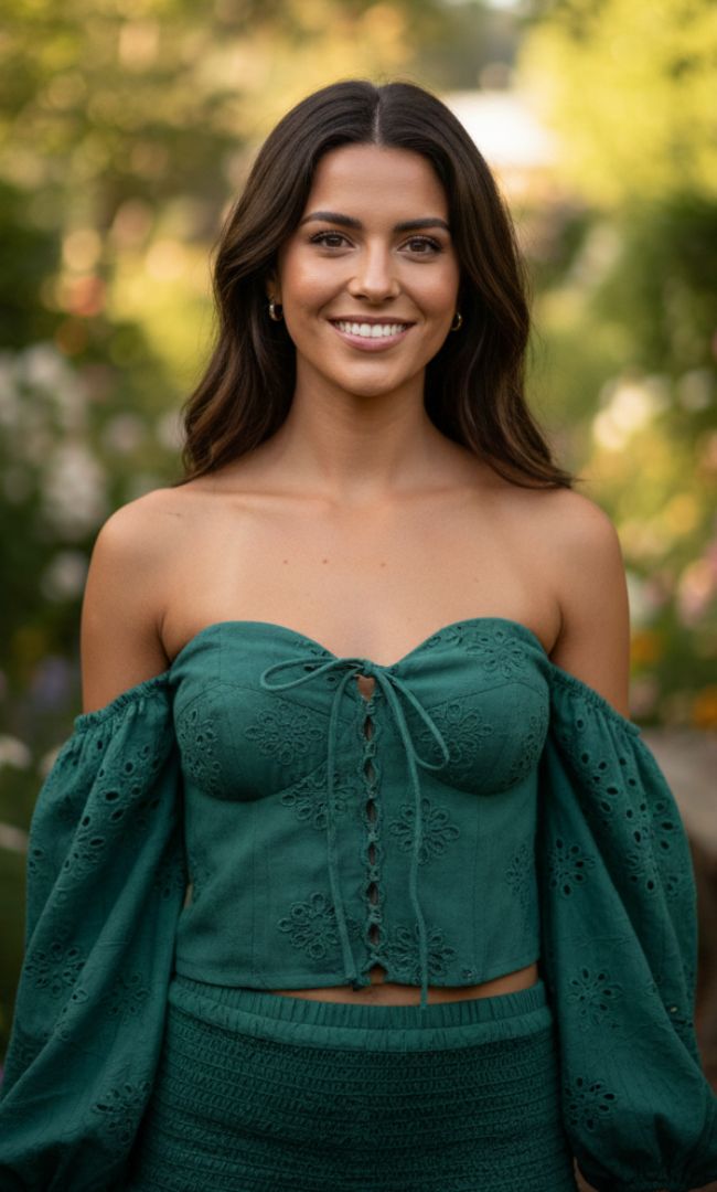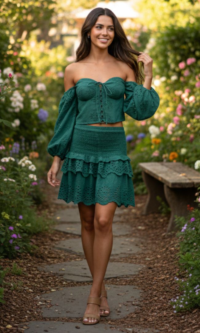 This enchanting emerald green co-ord set features an off-the-shoulder puff-sleeve top and a flirty tiered mini skirt, both crafted from breathable cotton with intricate schiffli embroidery. The smocked waist and delicate scalloped hem create a breezy, romantic silhouette that is perfect for golden hour garden parties or elevated summer outings.